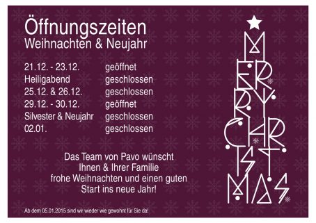 Liebe Kundinnen, liebe Kunden bitte beachte die Sonderöffnungszeiten während Weihnachten und Neujahr. Ab dem 05.01.2015 sind wir wieder wie gewohnt für Dich da. Du kannst natürlich wie gewohnt jederzeit einen Termin Online buchen. Vielen Dank für Dein Verständnis. Wir wünschen Dir von Herzen besinnliche und erholsame Feiertage!